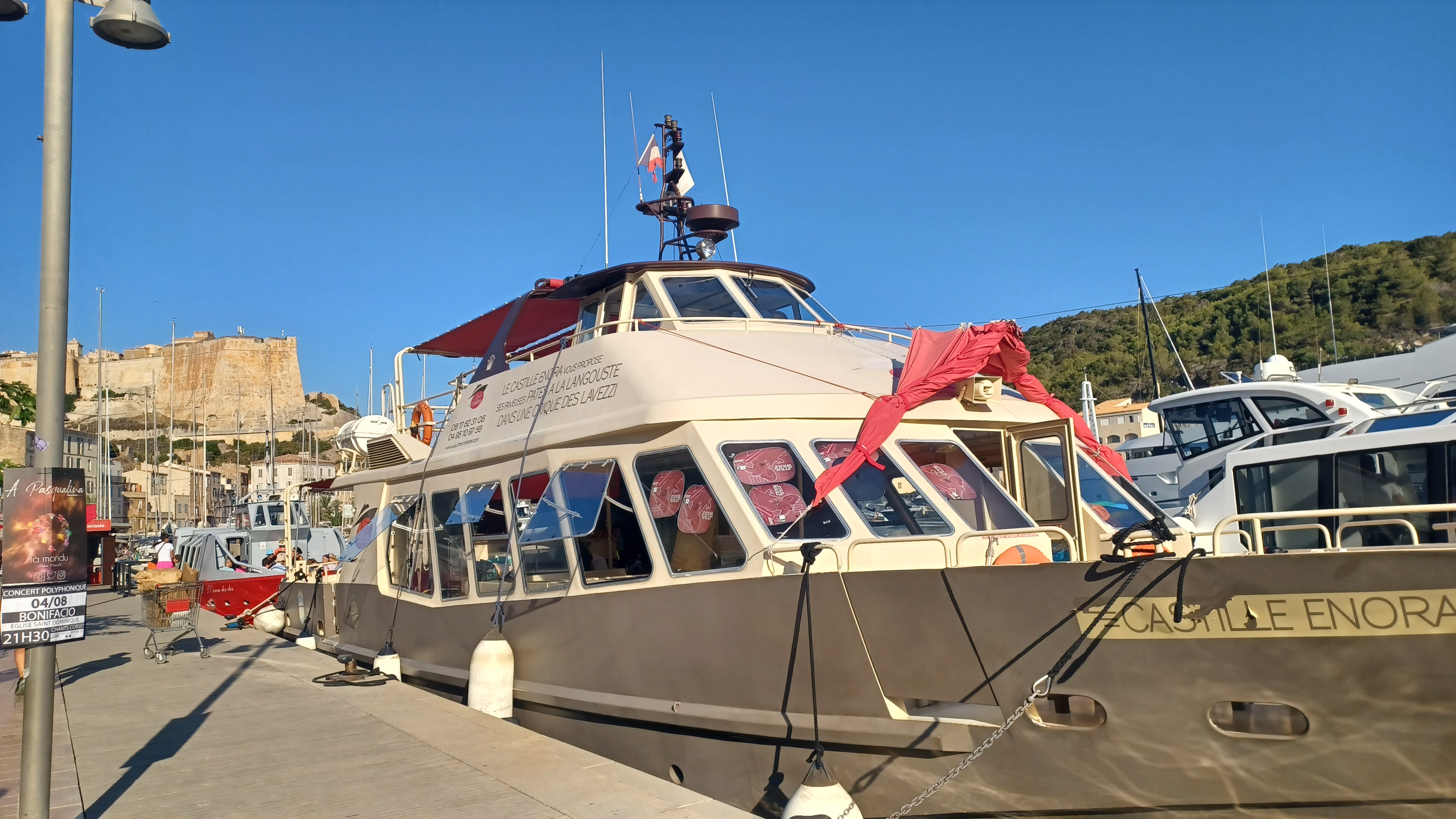 Je recommande ce bateau ou nous avons passé une tres bonne journée. Le personnel est tres sympa. Le matin petit dejeuner café et gateaux a 9h. A midi assiette charcuterie avec fromage Corse tres genereuse avec en apero un petit pétillant delicieux (du genre Asti italien). Ensuite pates avec demi langouste a la sauce tomate +un vin blanc frais , puis en dessert :fruit (melon et pastèque) et enfin café. Effectivement, comme je l ai vu dans certains commentaires les moteurs tournent aux ralenti durant le repas. Je suppose qu il y a une raison (frigos ???!) Sinon je ne vois pas l interet economiquement parlant. Pour la balade, apres la sortie du port, qui est tres jolie avec ses belles criques, nous sommes partis sur les iles de lavezzi qui sont magnifiques.Petite marche a notre guise pour la visite de cette endroit sauvage et protégé, puis comme l eau y est tres limpides et poissoneuse: baignade. Apres le repas visite d autres endroits des alentours avec commentaires interessants, puis retour en longeant les falaises de Bonifacio. Tres bon rapport qualité prix pour une journée géniale et inoubliable, comme ils disent sur la brochure.